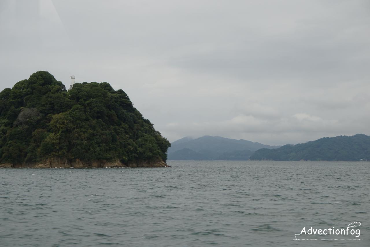 この航路では松山から音戸の瀬戸まで、西側に島が見え続けるこのような景色が続き、船内は心地よく寝る人が多くなります。