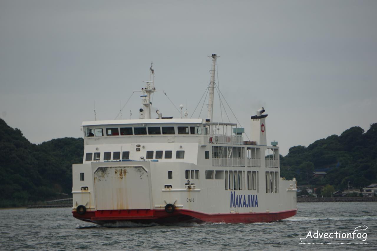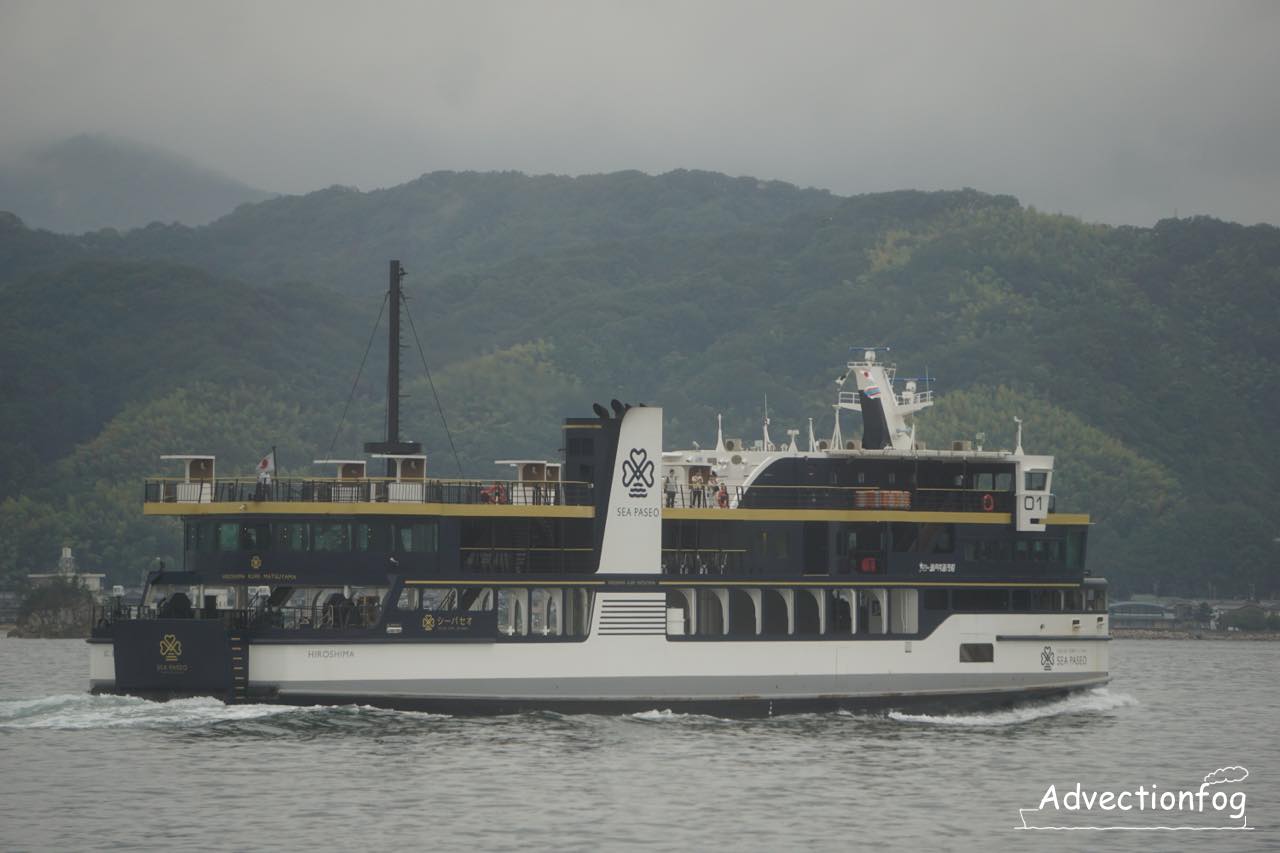 - 音戸瀬戸の手前で、スーパージェットの2倍以上の時間をかけていくフェリー「シーパセオ」を追い抜きます。この航路では、フェリーに乗ると追い越す高速船を間近に撮影できます。ただし、釣島水道の野忽那島付近では、高速船は西側を航行することがあり少し離れます。
