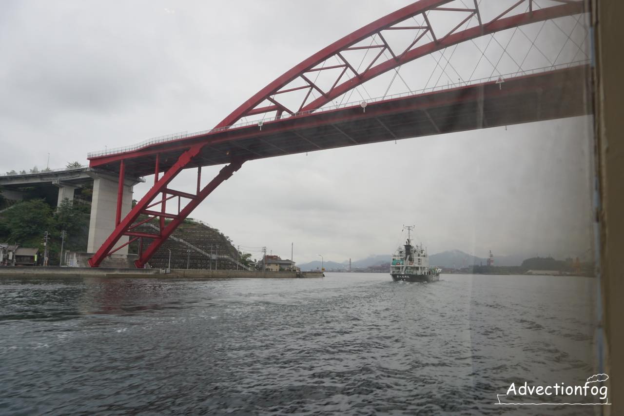 - この航路のハイライトは狭い音戸瀬戸の通過です。高速航行するスーパージェットもここだけ、速度を落としてゆっくりと通過します。特に今回のように前に小型貨物船が航行しているときは、それに続いていくためゆっくりになります。