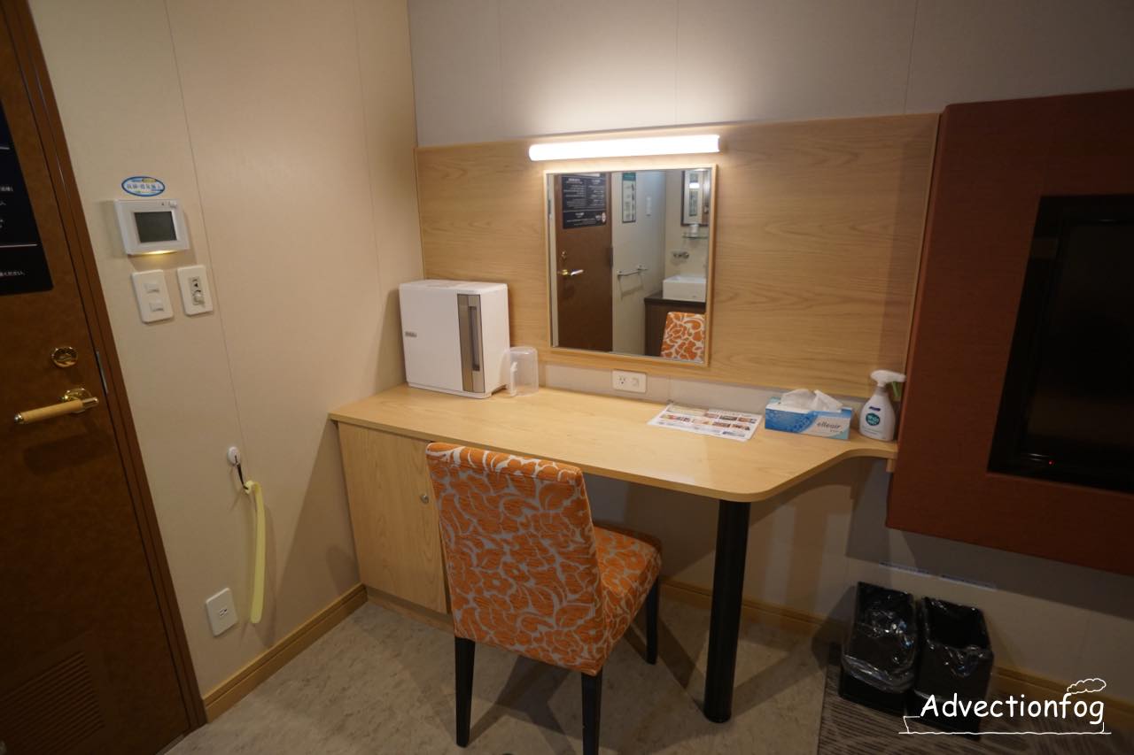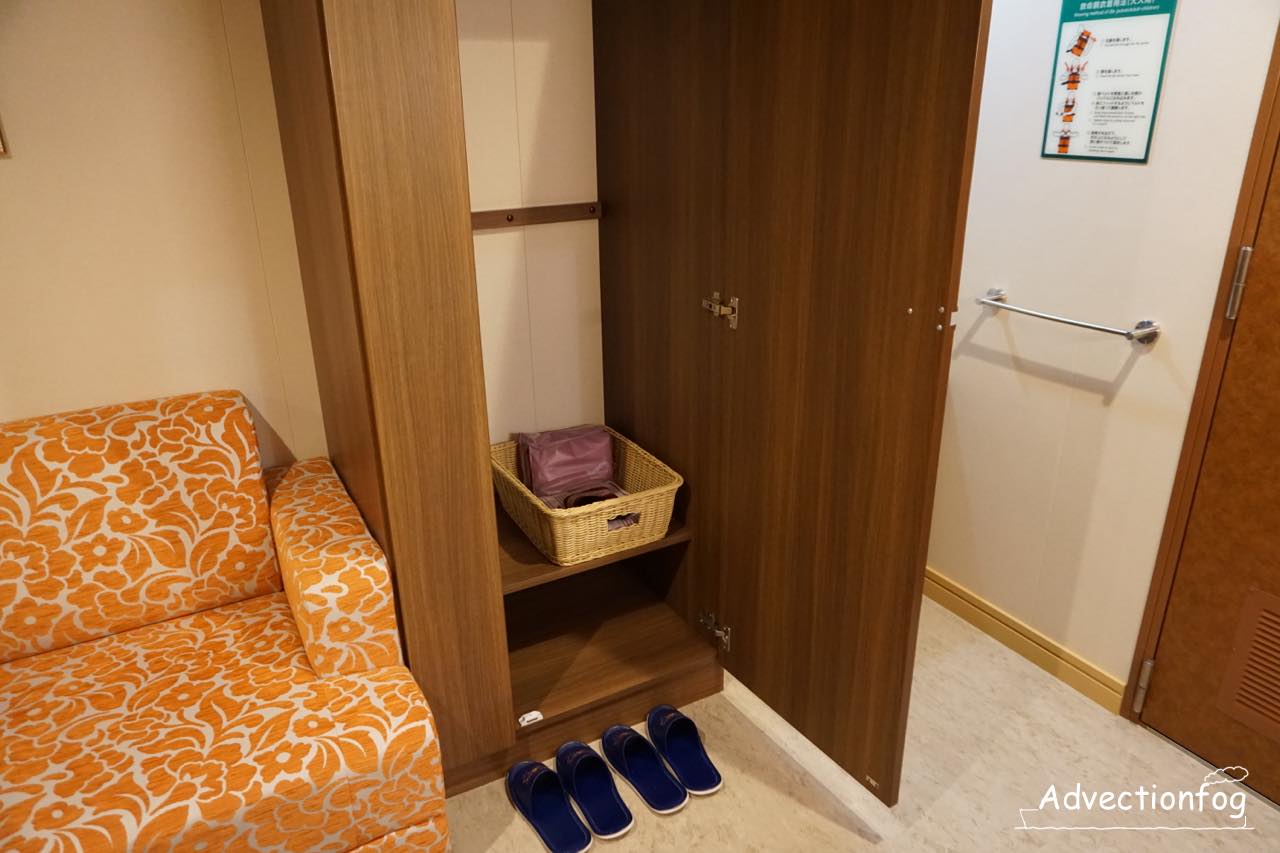- クローゼットの中にフェイスタオルや歯ブラシなどのアメニティーがあります。客室内にバス・トイレはない部屋ですので、バスタオルはありません。船内の展望バスルーム(大浴場)や、シャワールームを利用するときに必要なタオルは持ち込んでおく必要があります。スポーツタオルであれば船内の自動販売機で1000円で販売されています。